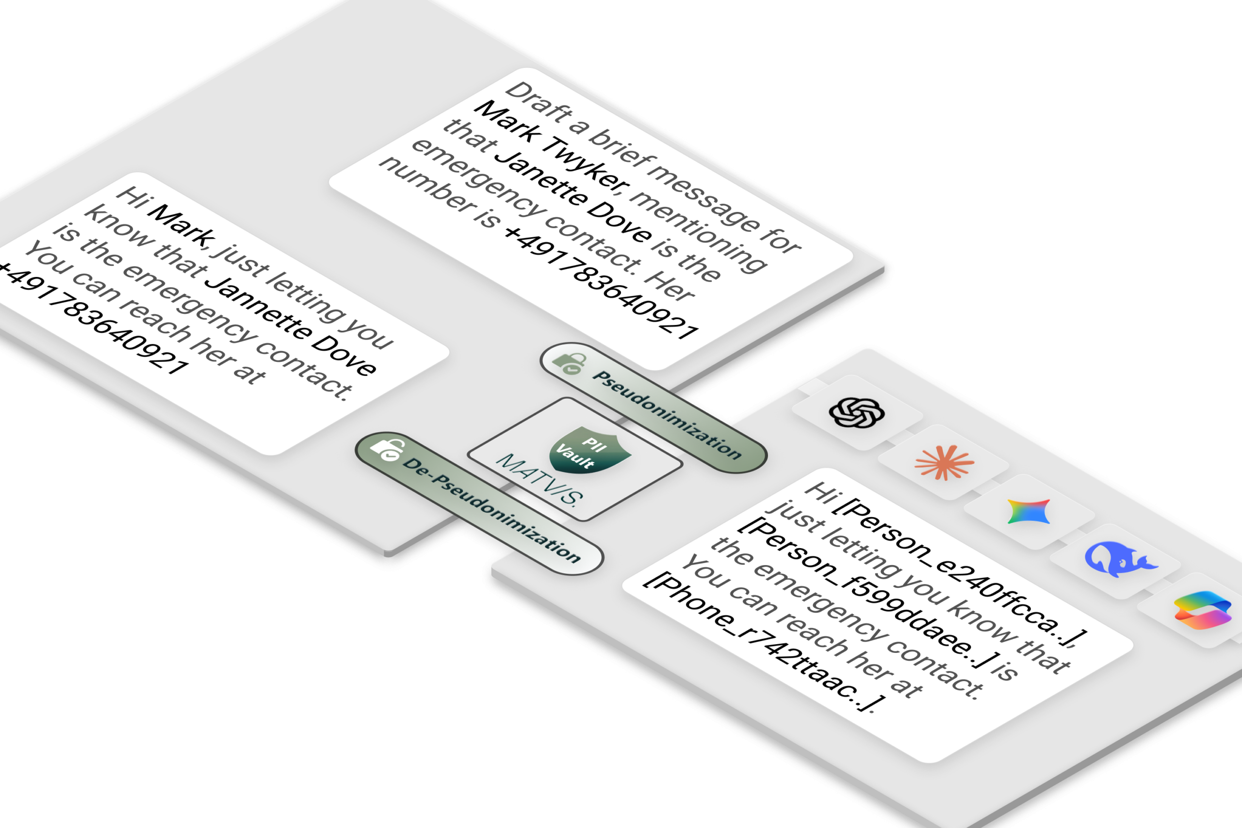 Personal data is pseudonymized, securely stored in your vault, and seamlessly de-pseudonymized in responses, so your team gets the answers they need without exposing identities.